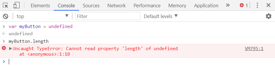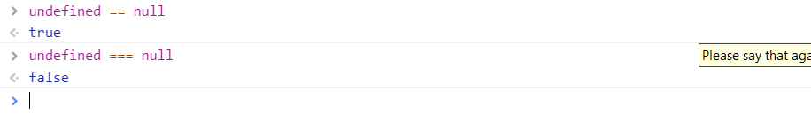 有意思的是,在 JavaScript 里,null 和 undefined 其实是不一样的,所以我们会看到两个不同的错误消息。undefined 表示未赋值的变量,而 null 表示变量值为空。可以使用严格等于号来证明它们不是同一个东西。