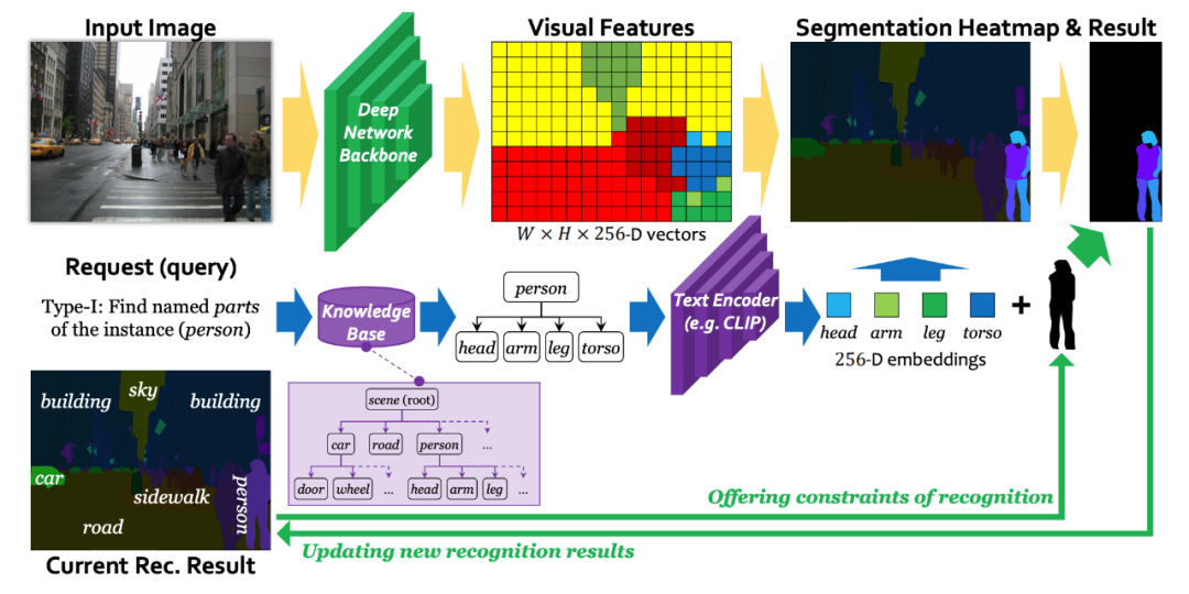 既然追求无限细粒度,我们就只考虑分割这种较为彻底的识别任务。如上所述,在知识库(数学定义见论文)的基础上,一张图像的无限细粒度分割,可以表示为一系列 request 任务的集合(数学定义见论文),而这些 request 可以分为两大类:不断调用这两类 request,就可以实现任意粒度的识别。