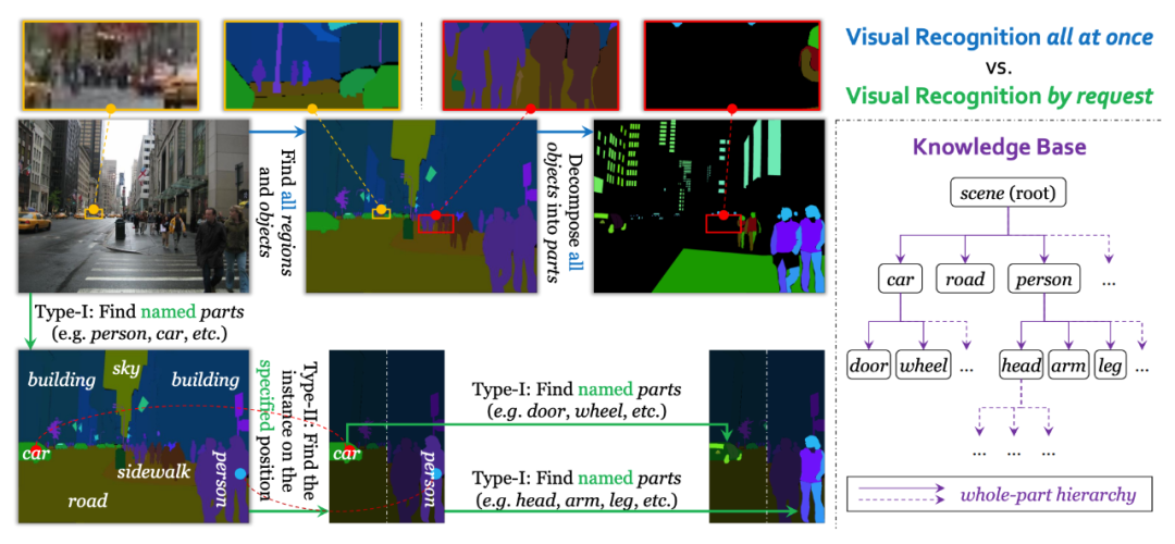 图2直观地对比了两种识别方式。在图中展示的复杂街景图像中,统一视觉识别定义了“人”、“车”等物体以及它们的部件,但是由于图像中某些物体尺寸太小,无法对这些物体以及它们的部件进行标注,这就产生了标注的不一致性。与之相比,按需识别并不假定图中所有物体都需要被标注出来,而是将标注任务表示为若干需求(request),标注者/算法只需要处理这些 request。具体地说,request 被分为两类: