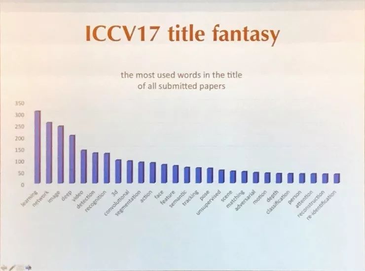 组委会统计了所有投递论文中,最常在标题中出现的单词。前几名自然依次是:learning、network、image、deep、video、detection和recognition。unsupervised、adversial、attention也榜上有名。