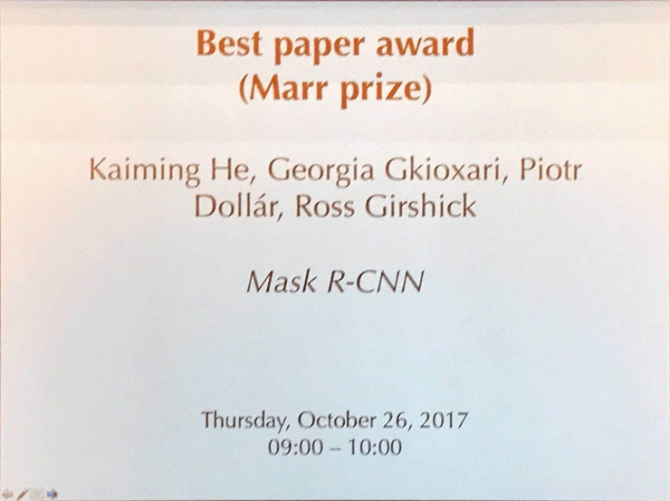 今年3月上传Arxiv的 Mask R-CNN 获得了最佳论文奖,一作就是何恺明!