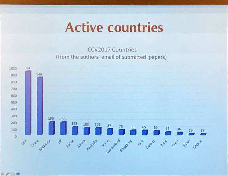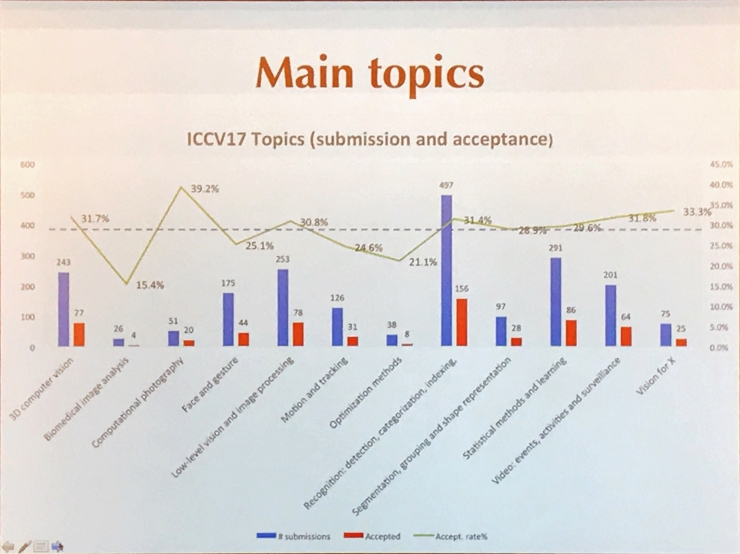 ICCV 作为计算机视觉的顶级会议,2017年共收到2143篇论文投稿,比上一届ICCV2015的1698篇增加了26.2%。共621篇被选为大会论文,录用比例28.9%;poster、spotlight、oral 比例分别为24.61%、2.61%和2.09%。