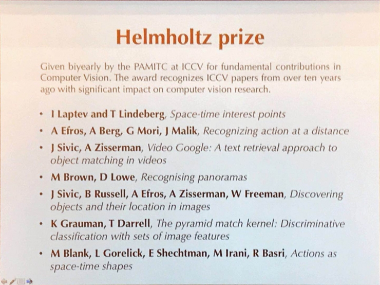 表彰超过10年前的ICCV上对计算机视觉研究做出巨大贡献论文的 Helmholtz奖颁发给了「Space-time interest points」、「Recognizing action at a distance」、「Video Google: A text retrieval approach to object matching in videos」、「Recognising panoramas」、「Discovering objects and their location in images」、「The pyramid match kernel: Discriminative classification with sets of image features」、「Actions as space-time shapes」7篇论文。