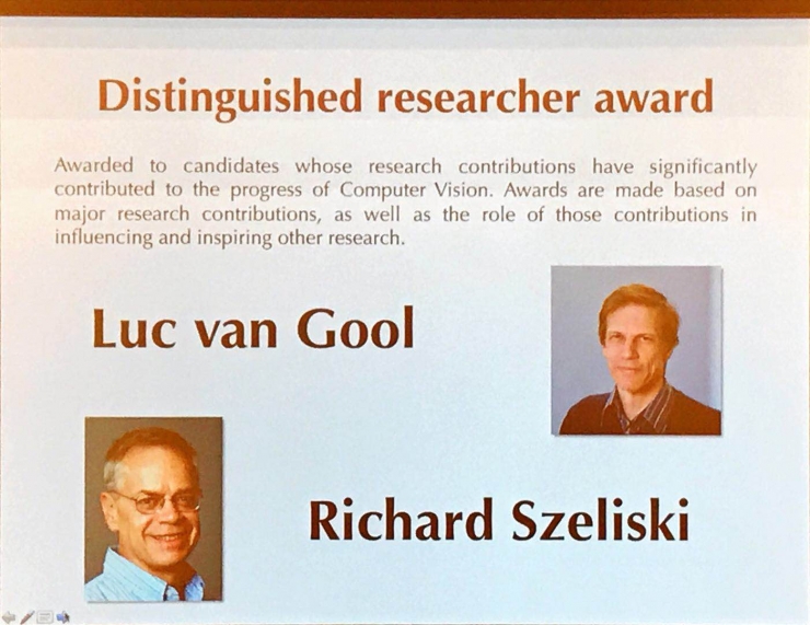 杰出研究者获得者是瑞士苏黎世联邦理工学院(ETH Zurich)计算机视觉教授 Luc van Gool 和现在在Facebook担任计算图像组研究科学家 Richard Szeliski (在清华大学获得工学学士、硕士和博士学位,曾在微软研究院工作20年)