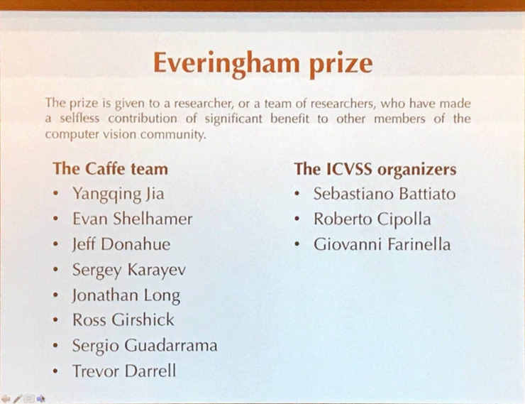 Everingham奖表彰的是对其它计算机视觉社区中的成员作出了无私贡献的研究者,贾扬清领衔的Caffe team获奖可谓实至名归。