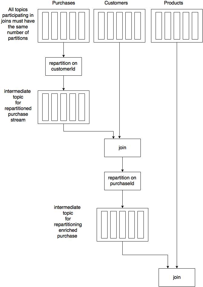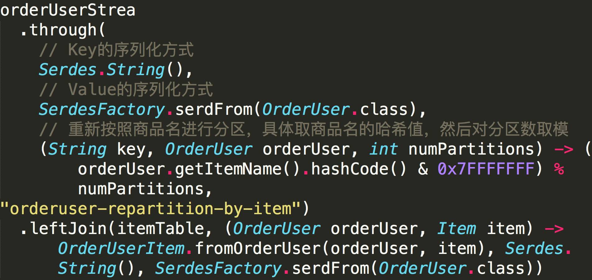 从上述代码可见,through时需要指定Key的序列化器,Value的序列化器,以及分区方式和结果集所在的Topic。这里要注意,该Topic(orderuser-repartition-by-item)的Partition数必须与itemTable对应Topic的Partition数相同,并且through使用的分区方法必须与iteamTable对应Topic的分区方式一样。经过这种through操作,orderUserStream与itemTable满足了Join条件,可直接进行Join。