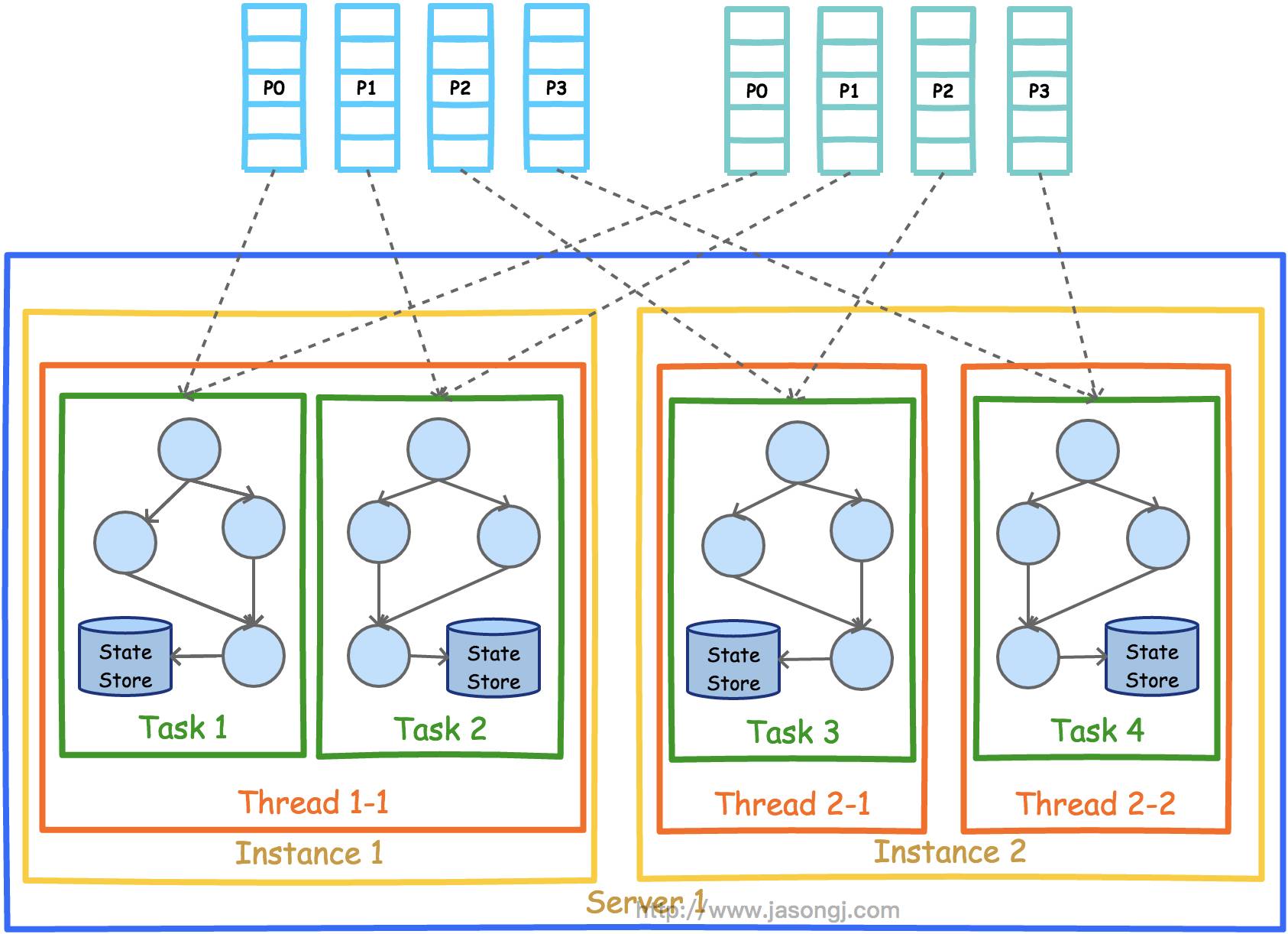 下图展示了在一个进程(Instance)中以2个Topic(Partition数均为4)为数据源的Kafka Stream应用的并行模型。从图中可以看到,由于Kafka Stream应用的默认线程数为1,所以4个Task全部在一个线程中运行。