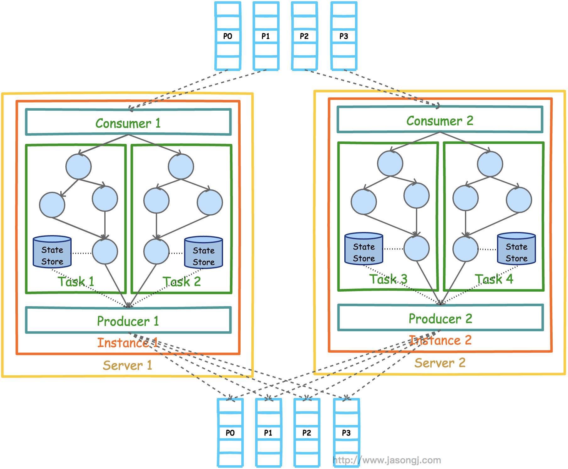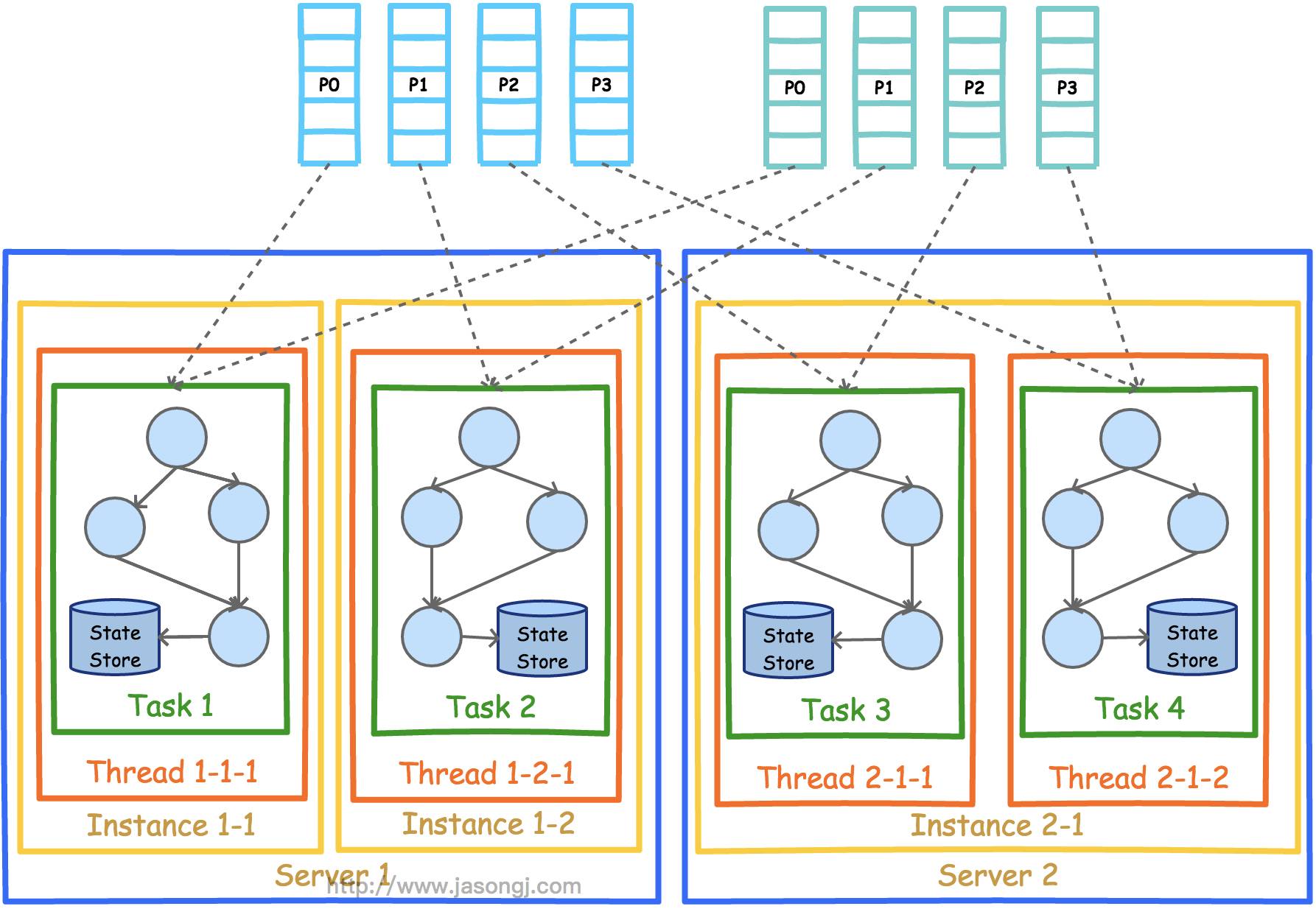 既然实现了多进程部署,可以以同样的方式实现多机器部署。该部署方式也要求所有进程的APPLICATION_ID_CONFIG完全一样。从图上也可以看到,每个实例中的线程数并不要求一样。但是无论如何部署,Task总数总会保证一致。