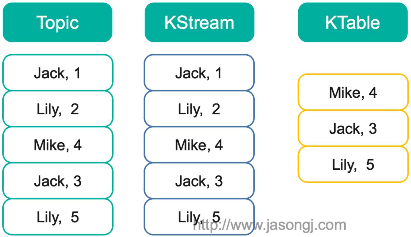 KStream是一个数据流,可以认为所有记录都通过Insert only的方式插入进这个数据流里。而KTable代表一个完整的数据集,可以理解为数据库中的表。由于每条记录都是Key-Value对,这里可以将Key理解为数据库中的Primary Key,而Value可以理解为一行记录。可以认为KTable中的数据都是通过Update only的方式进入的。也就意味着,如果KTable对应的Topic中新进入的数据的Key已经存在,那么从KTable只会取出同一Key对应的最后一条数据,相当于新的数据更新了旧的数据。