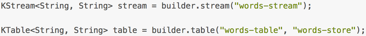 目前(Kafka 0.11.0.0)Kafka Stream的数据源只能是Kafka(如上图所示)。但是处理结果并不一定要如上图所示输出到Kafka。实际上GlobalKTable和KTable及KStream的实例化都须指定Topic(如下所示)。
