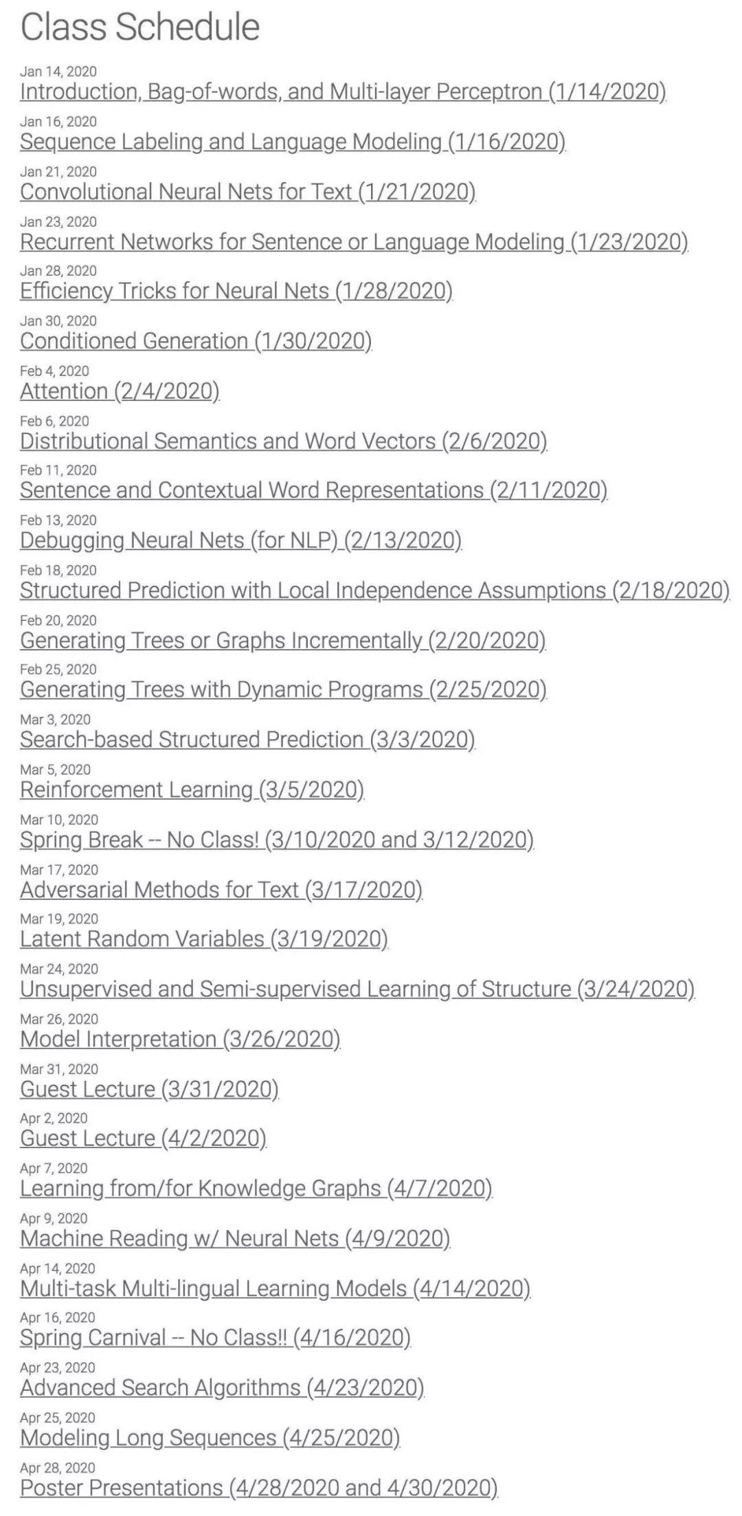 http://phontron.com/class/nn4nlp2020/schedule.html