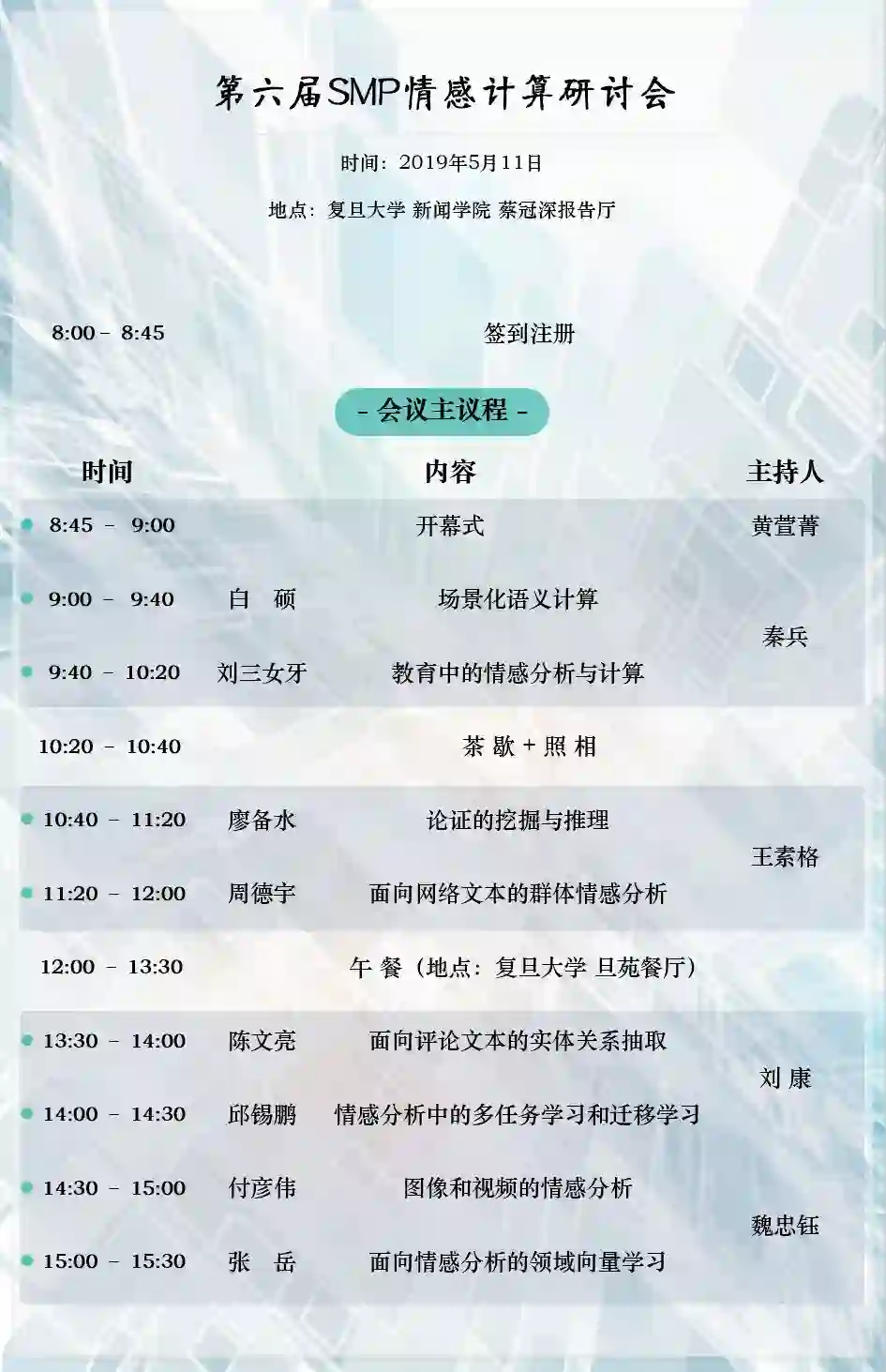 在中国中文信息学会社会媒体处理专委会情感分析工作组的指导下,由复旦大学大数据学院、计算机学院共同承办的“第六届SMP情感计算研讨会”将于2019年5月11日(周六)在复旦大学召开。