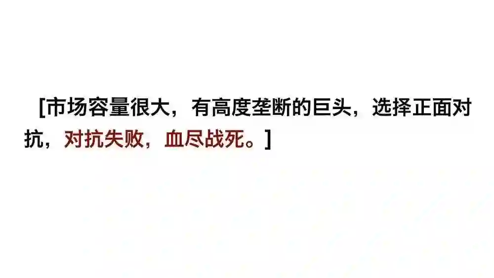 但是在市场容量大的领域里,最好选择这个赛道里虽然有巨头或不错的公司,但它的市场份额依然占到很小的领域,比如说家装,建筑辅材,养猪产业,市场容量都在千亿万亿量级,但即使是前三名的龙头企业其所占的市场份额也都只有几个百分比。如果选择了市场容量大但又有高度垄断的行业巨头,那么就很头痛了,如果创业公司还选择正面对抗,那么结果往往是非常惨烈的。
