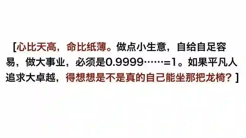 平凡人追求大卓越,得思考自己是否是否真的能坐那把龙椅。马云说平凡人做非平凡事,但事实上马云能在99年的时候,能超前预见到中国互联网未来很多机遇,能在一穷二白的那么艰难情况下,能说服17人竭尽所有跟着他一起创业,在那个时代已经远远超出平凡人的能力了。