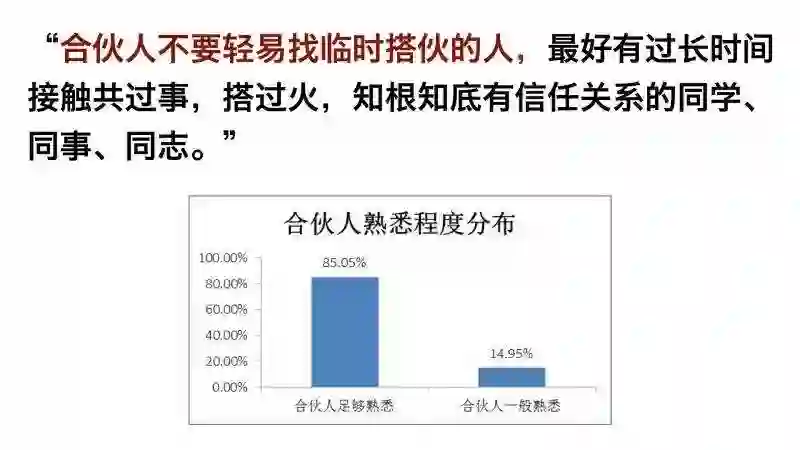 我们是创始团队最好找过去搭过伙,知根知底,有信任关系的同学、同事或者同志。我们研究的中国数百家估值过十亿以上的公司样本数据中,合伙人之间足够熟悉的比例高达85%,这个数据已经证明了不少问题。