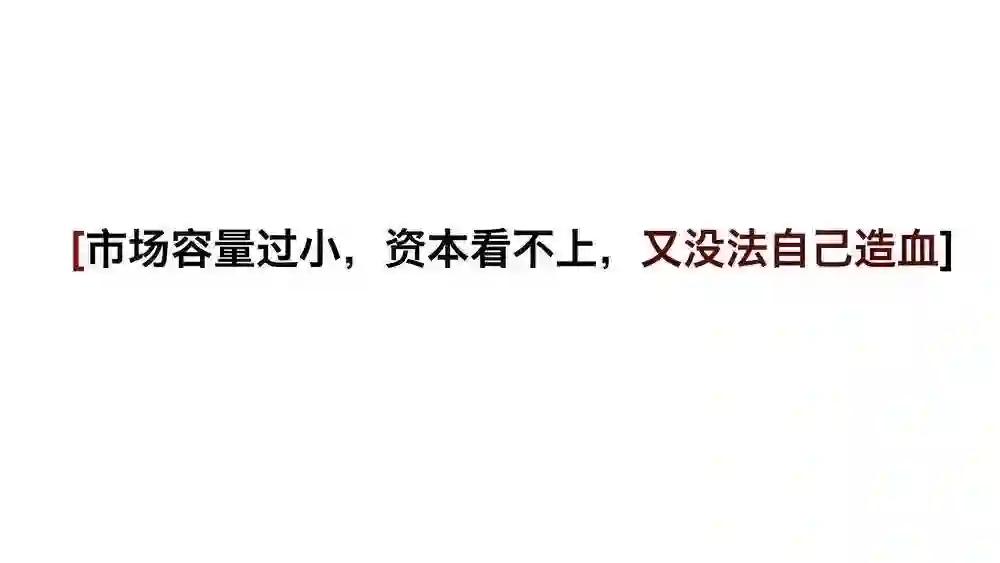 1. 选了一个市场容量小的领域,很难做大。企业也没法做强做到有自造血能力,后续融资一旦不利,现金流一断裂,公司就支撑不下去了。