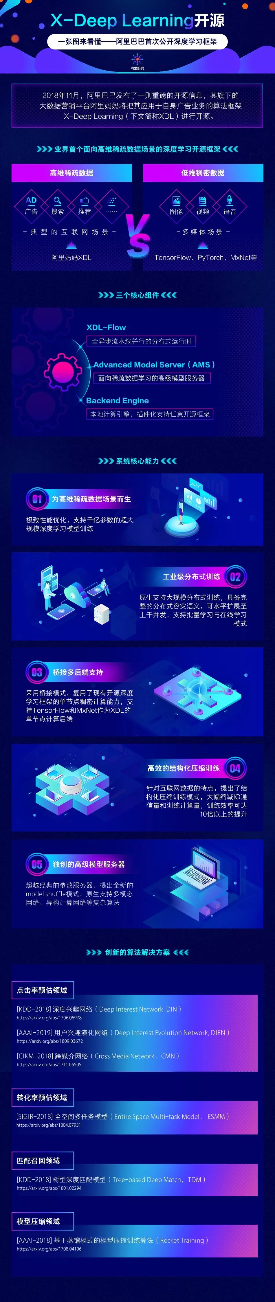 阿里巴巴内部透露将开源内部深度学习框架 X-DeepLearning的计划,这是业界首个面向广告、推荐、搜索等高维稀疏数据场景的深度学习开源框架,可以与TensorFlow、PyTorch 和 MXNet 等现有框架形成互补。