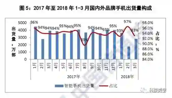 根据中国信息通信研究院发布的《2018年3月国内手机市场运行分析报告》,2018年3月份中国智能手机出货量2808.3万部,同比大跌28.6%,占同期国内手机出货量的 93.0%,前三个月累计出货量8187.0万部,同比下跌27.0%,同期国内手机出货量的93.7%。