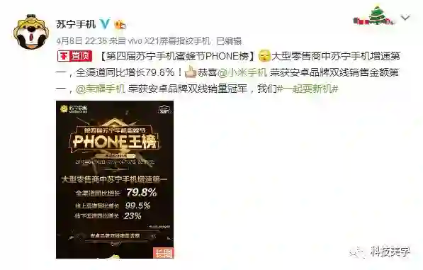 同天晚上,苏宁手机发布第四届苏宁手机蜜蜂节PHONE榜,凭借全渠道同比增长79.8%的成绩,稳据大型零售商中苏宁手机增速第一,再一次完成逆势增长。