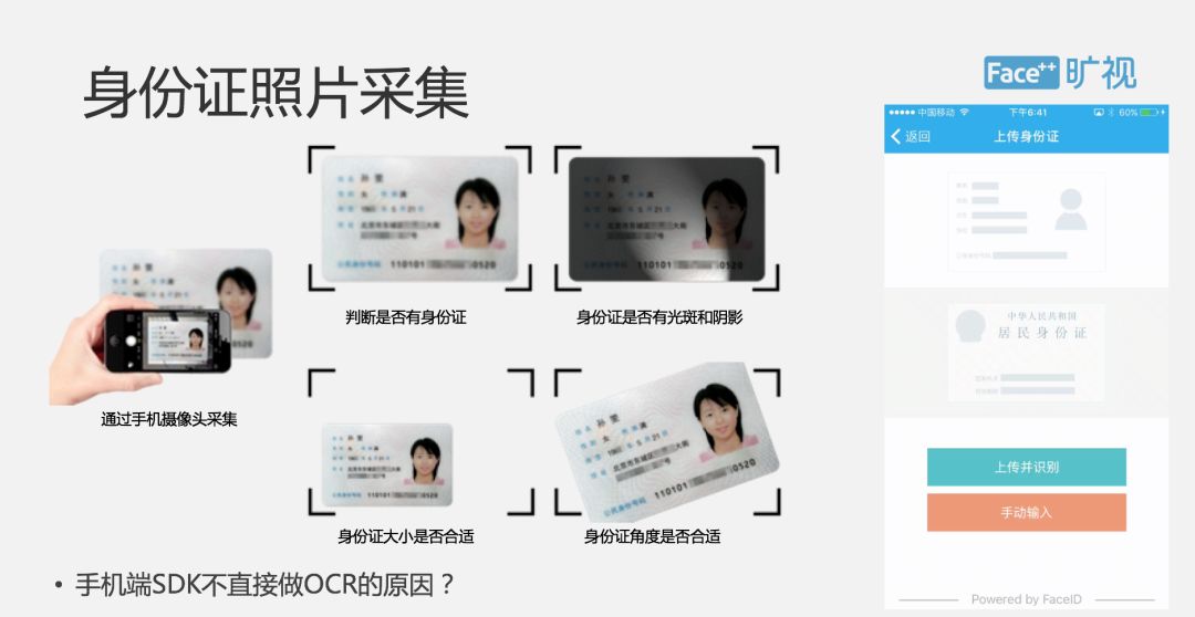 这个展示就是我们身份证采集以及身份证 OCR 的一些场景。先通过手机的摄像头去采集,在我们的云端去完成 OCR 识别以及物体分类,可以去判断是不是真实的身份证。有一个需要讨论的问题是,为什么我们把 OCR 放在了云端,而不是放在手机的 SDK 端呢?这个主要是安全方面的考虑,如果信息被黑客攻破,这在端上是相当危险的事。