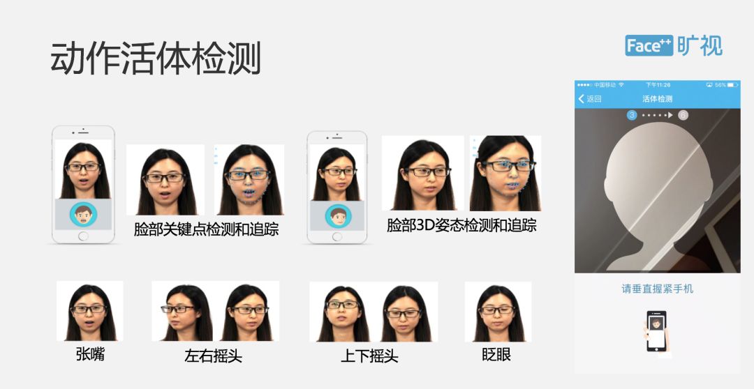 下面我们来去讨论一下最重要的活体攻击。在我们的产品里面提供了多种活体攻击的检测方案,包括随机、动态的活体,包括视频活体、炫彩活体等等。活体检测是我们整个 Face ID 最重要的一环,也是我们最重要的核心优势。这个 PPT 展示的是我们的动作活体,用户可以根据我们的 UI 提示进行点头、摇头这样的随机动作,所以我们每次随机动作都是 Serves 端去发出的,这样也保证我们整个动作的安全性。这里面有些技术细节,包括人脸质量检测,人脸关键点的感测跟跟踪,脸部的 3D 姿态的检测。这是我们整个技术的一些核心竞争力。然后我们会帮助用户定义一套 UI 界面,如果用户觉得我们 UI 界面不好也可以直接去修改。