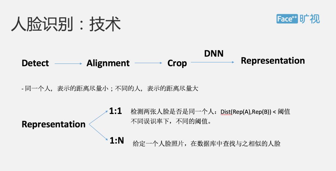 前者主要是比较两张人脸识别是不是同一个人,它的原理是我们去计算两张人脸表示的距离,如果这个距离小于一个域值,我们就会认为这个是同一个人,如果是大于某一域值,我们就认为它不是同一个人,在不同的误识率下,我们会提供不同的域值。第二个 1:N 的应用,主要应用场景是安防,也就是说我们提供一张人脸照片,在数据库里面去查找已知,最相似的这样一个人脸是 1:7 的应用,FaceID 主要应用的技术场景是 1:1。