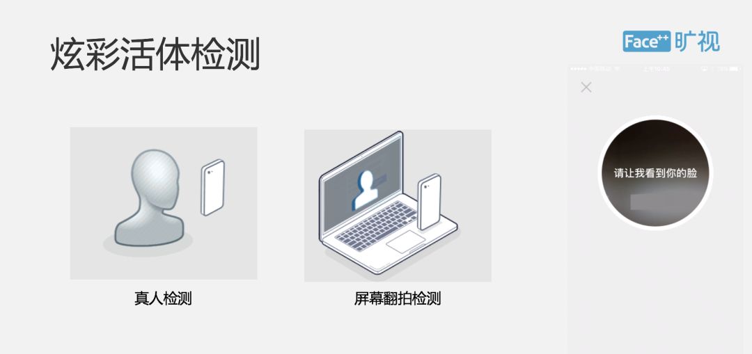 我们提供一种叫炫彩活体的检测方法,这个是 Face++ 独特独创的一种根据反射光三维成像的原理进行活体检测,从原理上杜绝了各种用 3D 软件合成的视频、屏幕翻拍等等的攻击。从产品形态上来说本身又是一个视频,现在可能看不到,就是屏幕会发出一种特定图案进行活体判断。
