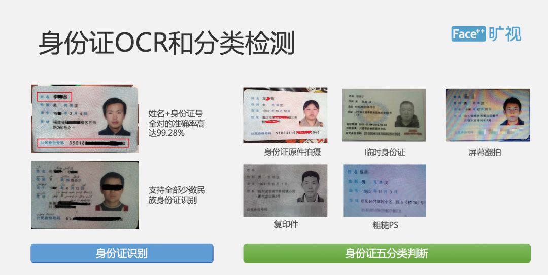 我们在 OCR 里面还加入了很多逻辑判断,例如大家知道在身份证号里面是可以看出来用户生日还有性别信息,如果我们发现身份证上的生日跟身份证号判断出来的信息不一样,我们就会在 API 的结果里面给用户返回逻辑错误,这是用户可以根据业务逻辑可以自行进行处理的。