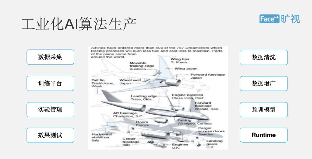 下面我简单介绍一下整个工业化 AI 算法的一个产生过程,其实整个流程可以看成是数据驱动,包括数据采集、清洗、标注,包括数据增广、数据的域训练模型、时间管理,还有 SDK 封装等等。