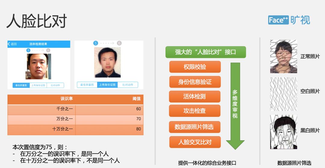 大家可以看一下左侧的这张表,然后这边的返回值里面提供了千分之一、万分之一、十万分之一不同的近似度,这些表示的是误识率,在不同的误识率下会有一个域值,假设我们认为在千分之一误识率下,如果分数大于 60 分,我们就会认为是同一个人,所以这两张照片,我发现他们的这个近似度是 75,我们会说在万分之一的误识率下是同一个人,但是在十万分之一这种误识率下可能他们不是同一个人。