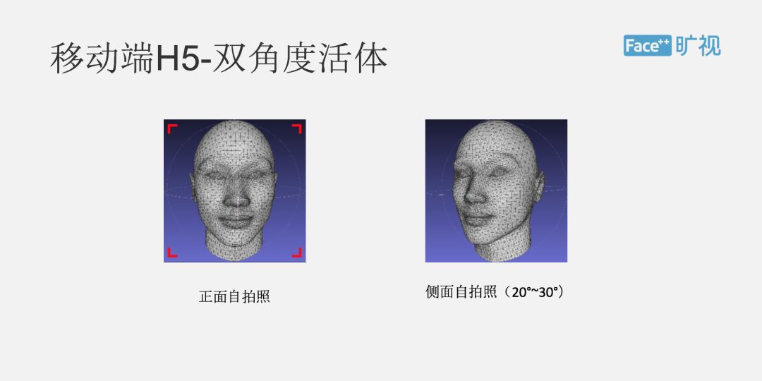 这样通过这三种方案去判断就是活体检测,除了刚才我们介绍的一些比较典型的方法之外,我们也在去尝试一些新的包括双角度活体跟静默活体。双角度活体是用户拍一张正脸的自拍照与侧面自拍照,通过这种 3D 建模重建的方式来判断是不是真人,我们的双角度活体,静默活体,为用户提供一种非常好的用户体验,相当于用户拍一个两秒钟的视频。