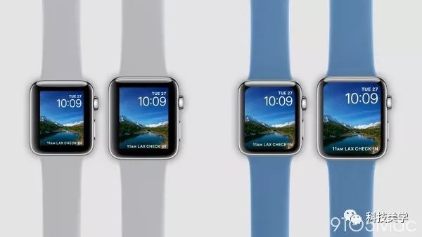 单纯的数字可能并没有太多感觉,所以泄密达人Benjamin Geskin就绘制出了两个版本Apple Watch的屏幕对比效果图。新的Apple Watch采用了更窄的边框,同时机身的四个角都进行了圆角处理,所以看起来效果非常不错。