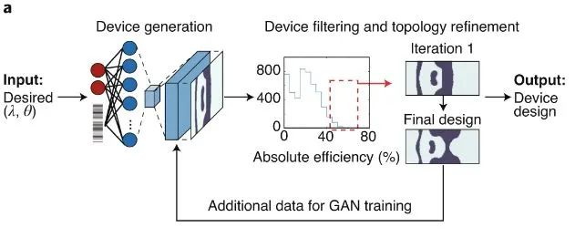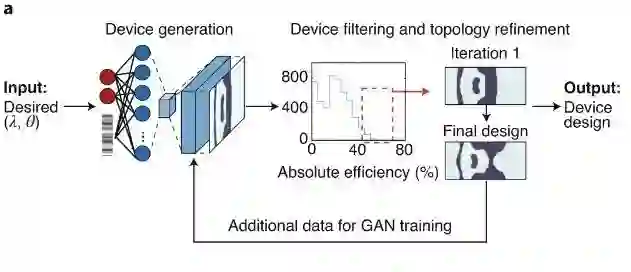 这种方法避免了生成训练集的过程,因为生成网络直接通过电磁仿真来学习设备几何形状与光学响应之间的物理关系。损耗函数使得它可以以更高的效率为设备提供更高的权重,并减少可能被锁定在局部最优值中的低效率设计的影响。结果是,可以将生成网络的压缩空间表示范围缩小到高效设计的子域。所提出的方法仅需要直接基于伴随的拓扑优化计算的计算成本的10%。
