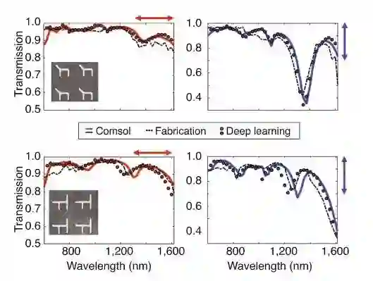 如图所示,深度学习的结果与数值模拟及实验测得的数据拟合良好,可以充当快速模拟器和逆设计工具。