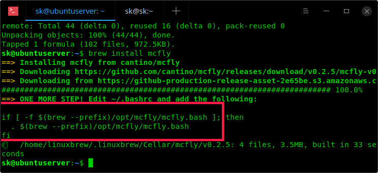 在 Linux 中,McFly 可以使用 Linuxbrew 来安装。如若你还没有安装过 Linuxbrew,那么你可以参考下面的这个链接。(LCTT 译注:从其 GitHub 主页[1]了解到也可以下载其二进制来使用。)