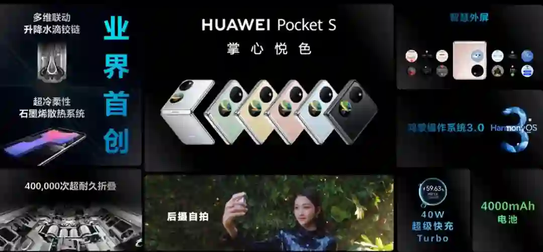 其他硬件上,华为 Pocket S 搭载了 4G 的骁龙 778G 处理器,内置 4000mAh 电池,支持 40W 快充,有侧边指纹解锁和人脸解锁,支持 WiFi6。系统上,华为 Pocket S 预装 HarmonyOS 3,支持超级中转站、智慧外屏、超空间压缩技术、卡片组合、智能桌面布局等功能。