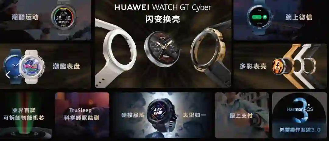 华为 WATCH GT Cyber 通过温度冲击、流体污染等 16 项高强度军规测试,支持 50 米防水,拥有 100+ 种运动模式,并推出了个性运动模式,此外还支持心率监测、血氧检测、科学睡眠监测、女性健康管理等健康功能。值得一提的是,华为 WATCH GT Cyber 搭载了腕上微信,支持微信语音、文字、表情包快捷回复等。