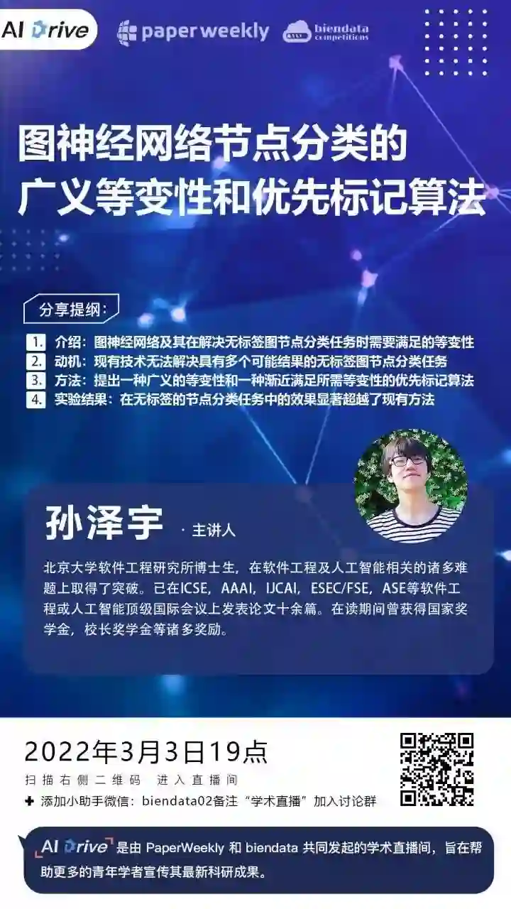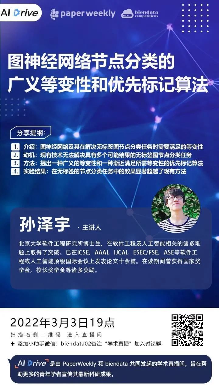 本期 AI Drive,我们邀请到北京大学博士生孙泽宇,为大家在线解读其发表在 AAAI 2022 的最新研究成果:Preferential Labeling for Unattributed Node Classification in GNNs。对本期主题感兴趣的小伙伴,3 月 3 日(本周四)晚 7 点,我们准时相约 PaperWeekly 直播间。