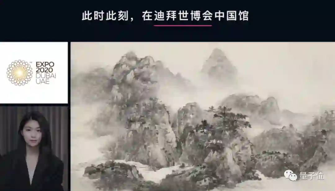 在迪拜世博会中国馆,正在展出AI画家夏语冰的一系列水墨画作品《山水精神》。