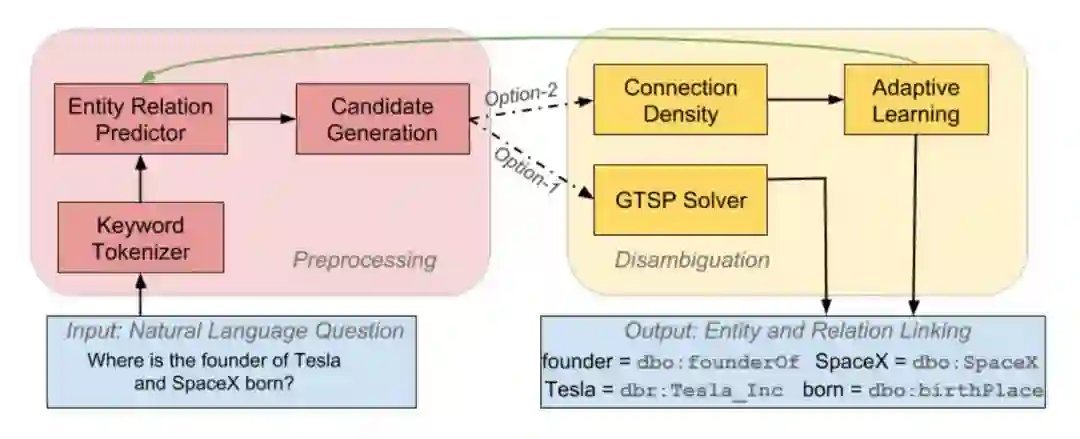 3. 额外的,本文提出了一种自适应实体/属性预测方法。如果消歧后某个实体/关系和它最终链接到的 URI 的置信度低于阈值,则可能预处理步骤的第二个子过程(实体/关系预测)有错误。在这种情况下,该工作会更改该关键词的实体/关系标签,重新执行候选生成和消歧步骤,从而获得整体精度的提升。