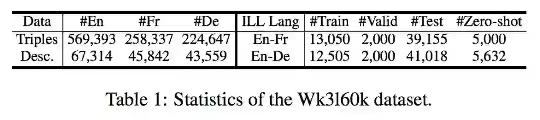 实验数据说明:文章实验数据来自 DBPedia 中抽取的子集 WK3160k,由英法德三语构成,其中每种语言数据中包含了 54k-65k 规模的实体。具体统计信息如下表:
