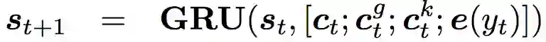 对于词“of”,由于无法找到对应的子图,所以就采用特殊子图 Not_A_Fact 来编译。之后,采用基于静态注意力机制,CCM 会将子图映射为向量 gi,然后把词向量 w(x_t) 和 gi 拼接为 e(xt)=[w(xt); gi],并将这个 e(xt) 替换传统 encoder-decoder 中的 e(xt) 进行 GRU 计算。