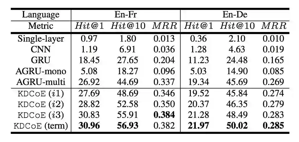 从实验结果上看,KDCoE 的效果依然是随着迭代次数的增加而上升,但从第一次迭代的结果可以发现,其优势的来源基础是 AGRU。这也反映出 AGRU 在编码上相对其他网络模型体现出了更优性能。