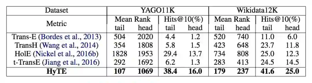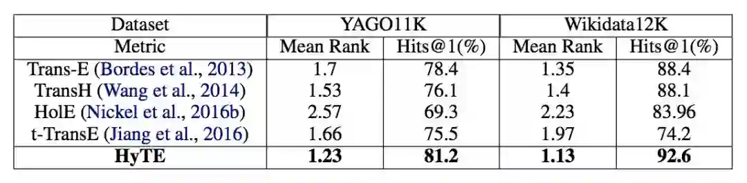 本文提出了 HyTE 模型,HyTE 不仅能够利用时间导向进行知识图谱图推理,还能够为那些缺失时间注释的事实预测 temporal scopes。实验结果表明该模型与传统模型或者同类模型相比都有着突出的表现。