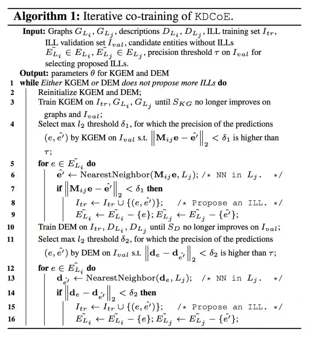 文章利用 KG 中存在的少量 ILLs 通过迭代的协同过程训练 KGEM 和 DEM 两个模块,过程大致描述如下: