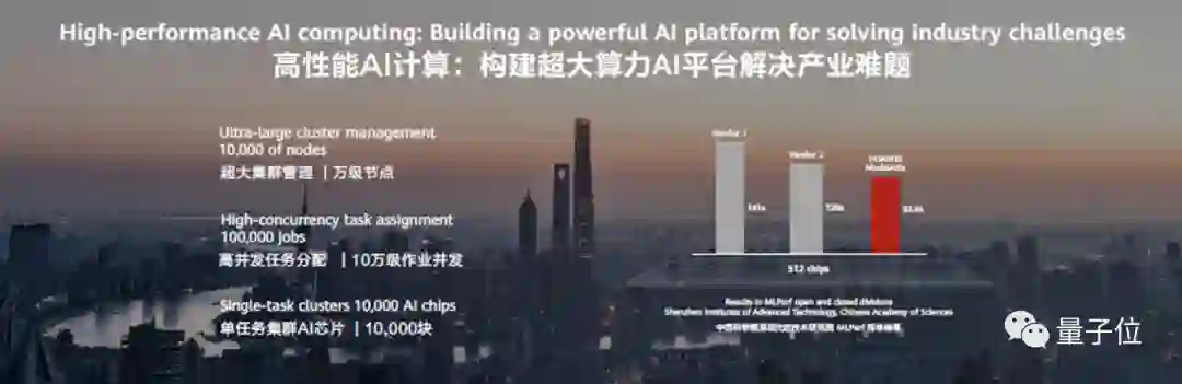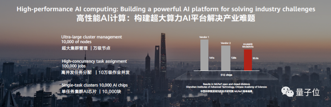 在MLPerf benchmart上的测试结果显示,在512芯片的集群规模下,华为云ModelArts成绩为93.6秒,优于英伟达V100的120秒。