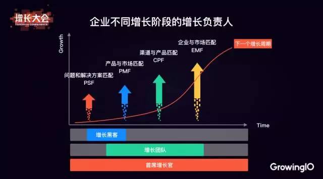 下面就进入一个公司与市场的匹配期,这个阶段一般你的 S 型曲线会趋平,好的企业会通过并购建立新的产品线,或者通过国际化获得进一步的增长。大家可以看到这五个时期,我们现在对应了三种不同的增长的角色,也就是我们今天讲的增长黑客、增长团队以及首席增长官。