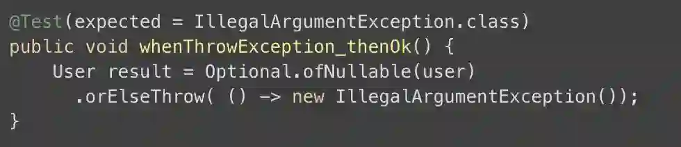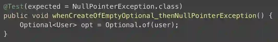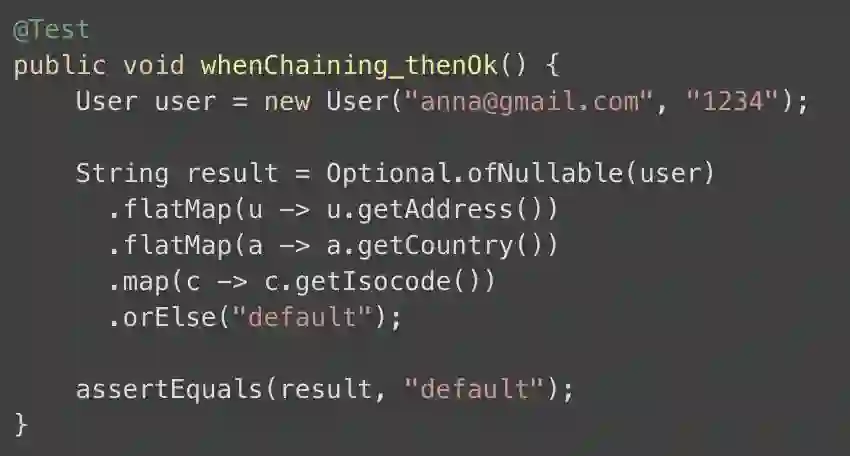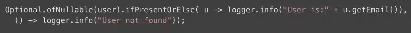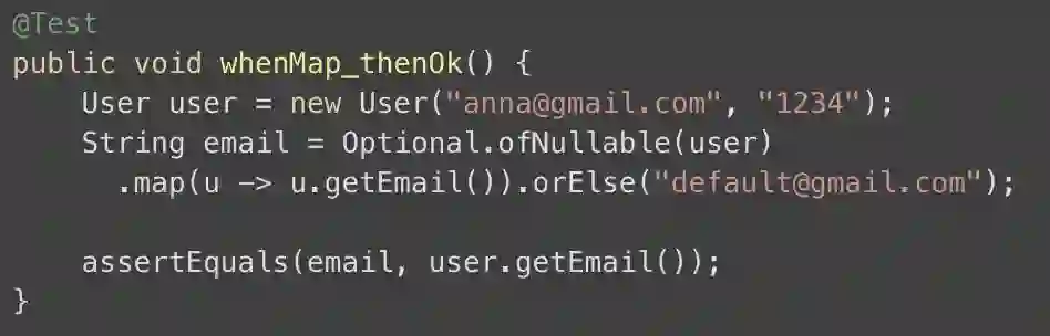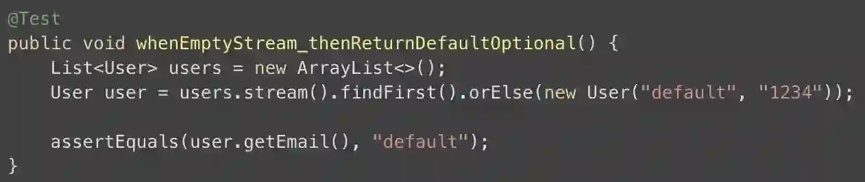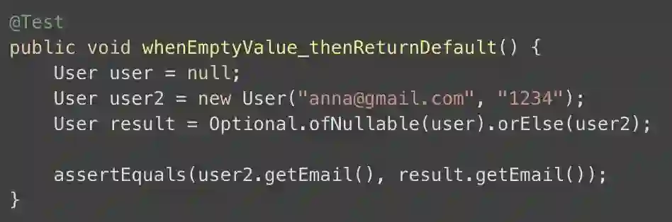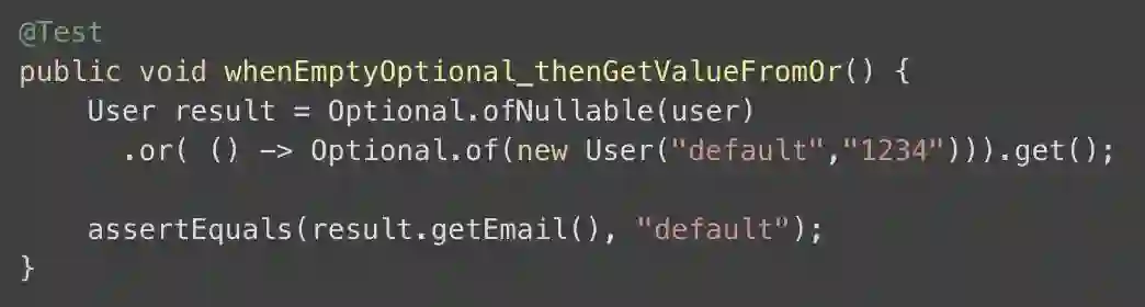 上面的示例中,如果 user 变量是 null,它会返回一个 Optional,它所包含的 User 对象,其电子邮件为 “default”。