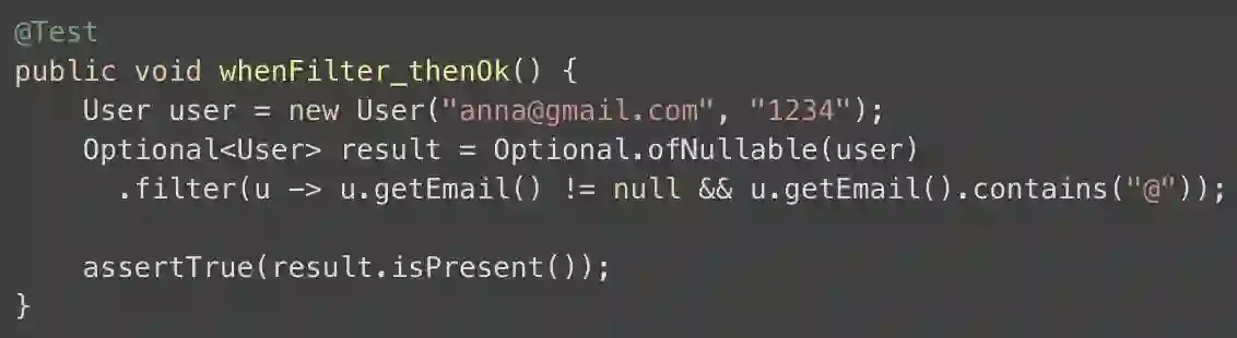 filter() 接受一个 Predicate 参数,返回测试结果为 true 的值。如果测试结果为 false,会返回一个空的 Optional。