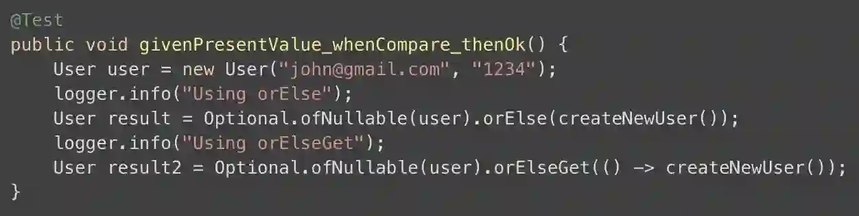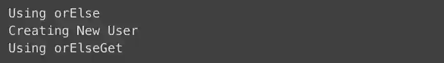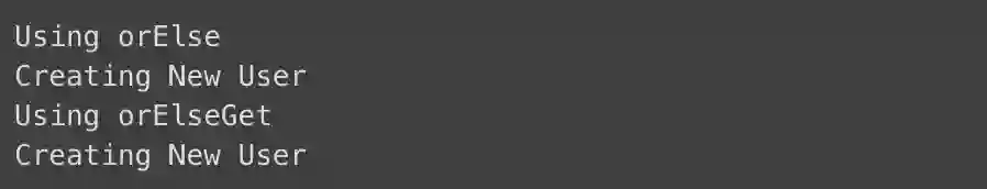 这个示例中,两个 Optional 对象都包含非空值,两个方法都会返回对应的非空值。不过,orElse() 方法仍然创建了 User 对象。与之相反,orElseGet() 方法不创建 User 对象。